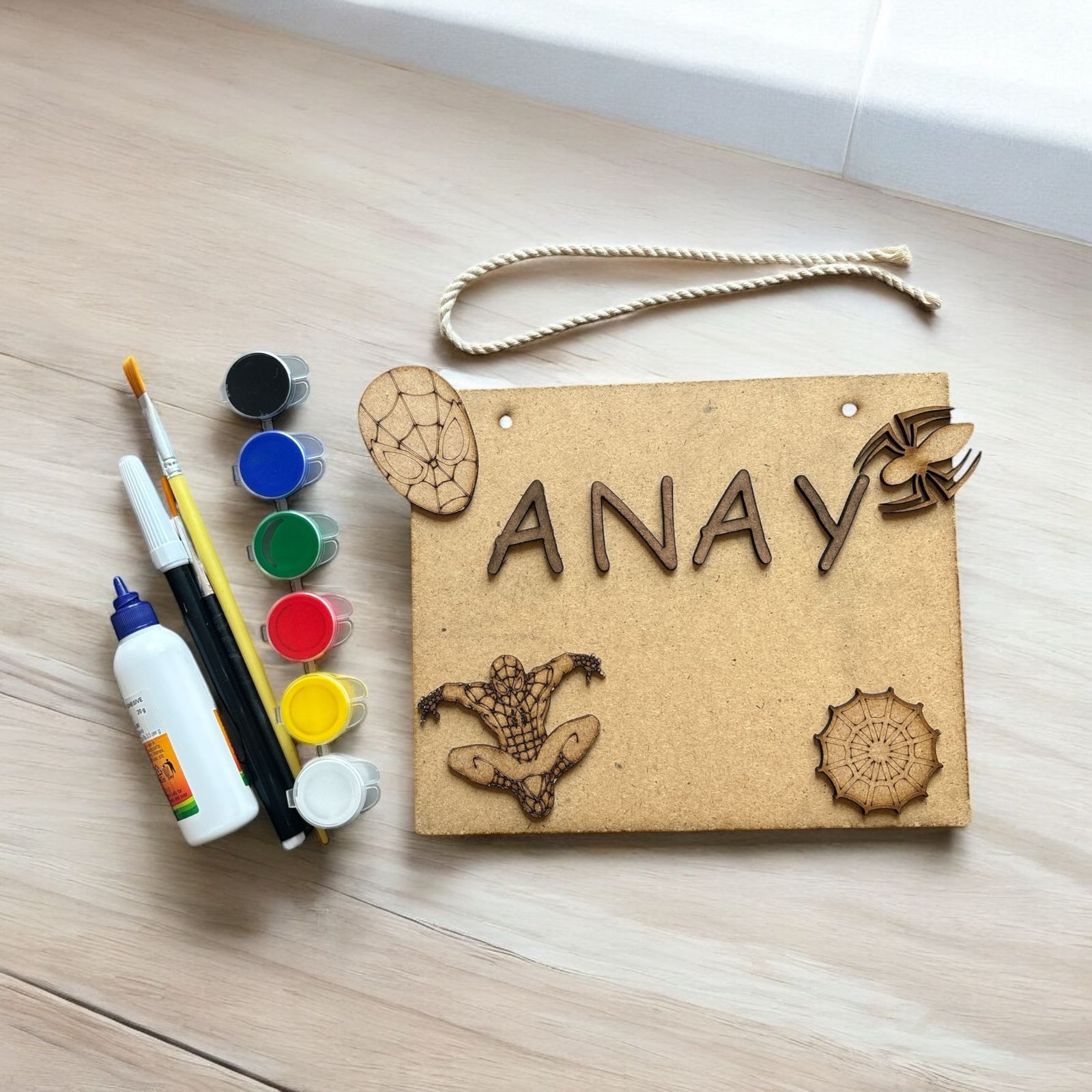 Let your child become the hero of their own story with the Spiderman Nameboard DIY Kit! Specially designed for young superhero fans, this bold and exciting 4.5 inch x 6.5 inch wooden nameplate (crafted from sturdy 4 mm thick wood) lets kids paint, decorate, and personalize their own Spiderman-themed nameboard—perfect for bedroom doors, study desks, or themed parties.
